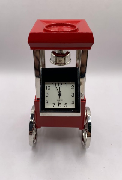 • COLECIONISMO - Miniatura de relógio em formato de maquina de pipoca nas cores vermelha e prata. Funcionando, porém sem garantias futuras. Medindo 10 x 4,5 x 4,5 cm