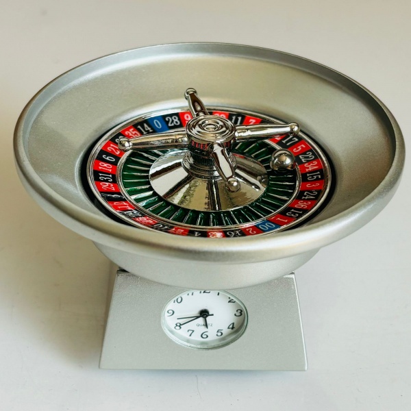 • COLECIONISMO - Miniatura de relógio em formato de roleta de cassino em metal. Medindo Largura 8 x Altura 5 cm x Profundidade 4 cm.