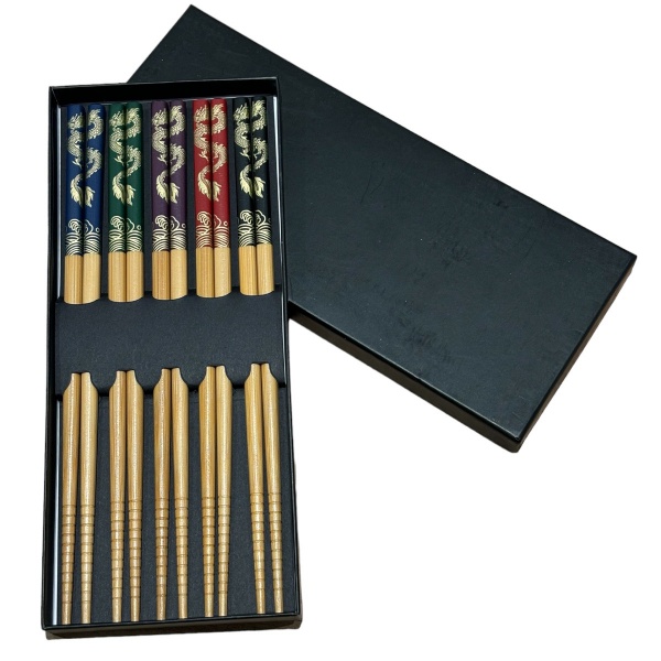 • 5 pares de hashis em bambu com cabos decorados com desenhos de dragões em diversas cores. Novos e na caixa original.