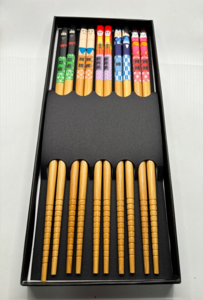 • 5 pares de hashis em bambu com cabos decorados com desenhos japoneses. Novos e na caixa original.