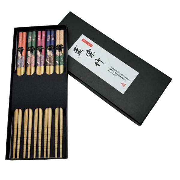 • 5 pares de hashis em bambu com cabos decorados com gueixas. Novos e na caixa original.
