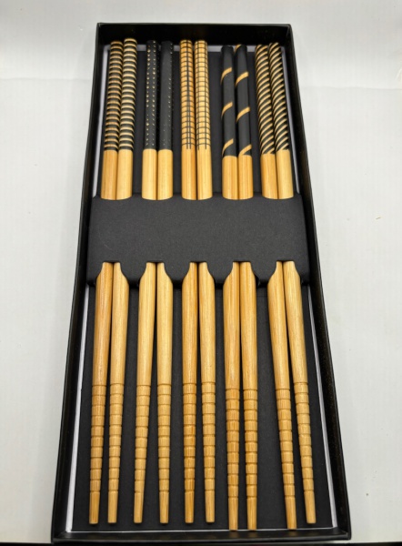 • 5 pares de hashis em bambu com cabos decorados na cor preta. Novos e na caixa original.