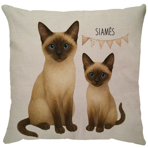 • Capa para almofada com zíper invisível, feita em linhão crú com impressão na frente de Gato Siamês e verso liso. Tecido em Linhão 100% Poliéster. Dimensões da Capa: 43 cm X 43 cm. Não acompanha enchimento.
