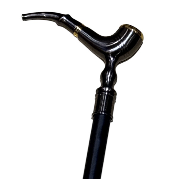 • Bengala fabricada em madeira escurecida de alta qualidade, com um imponente castão em formato de cachimbo. O diferencial está na parte interna: compartimento com estoque embutido.