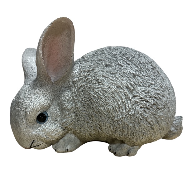 • Escultura em resina representando coelho na cor cinza com os olhos azuis. Medidas Comprimento: 20 cm x Largura: 12 cm x Altura: 14 cm.