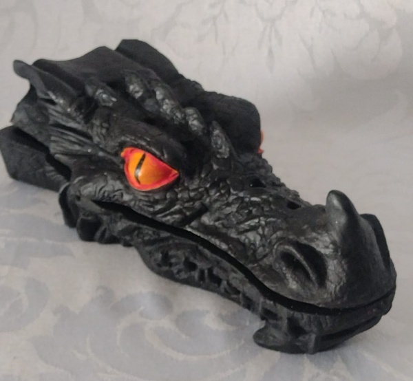 • Incensário cabeça de dragão super exótico, confeccionado em resina na cor preta, para suporte de incenso. Excelente acabamento, rico em detalhes e com a pintura realizada a mão. Medidas: Altura: 9 cm. Largura: 8 cm. Comprimento: 24 cm.