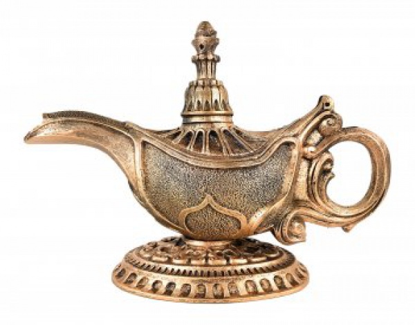 • Escultura representando lâmpada mágica em resina, patina dourada, muito bem detalhada. Medindo 32 x 22 x 12 cm.