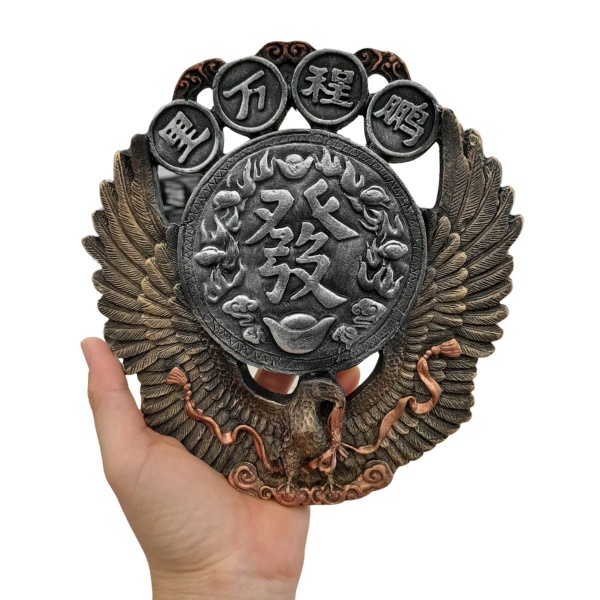 • Placa de parede com gancho representando águia chinesa em resina com excelente acabamento, rica em detalhes, com patina na cor ouro velho, detalhes prata e bronze. Confeccionado de modo semi-artesanal. Medidas: Altura: 21 cm. Largura: 19 cm. Comprimento: 1,5 cm.